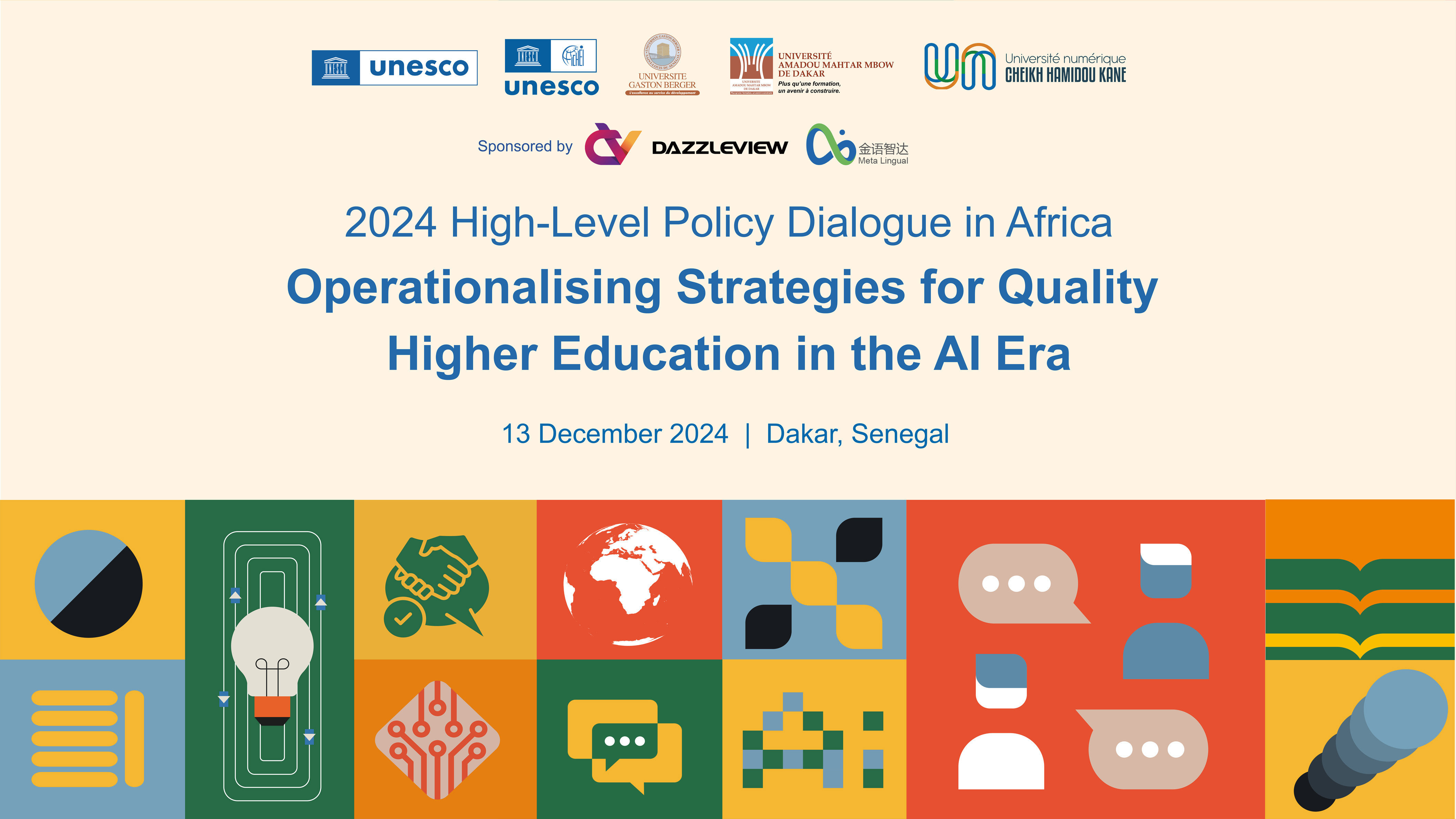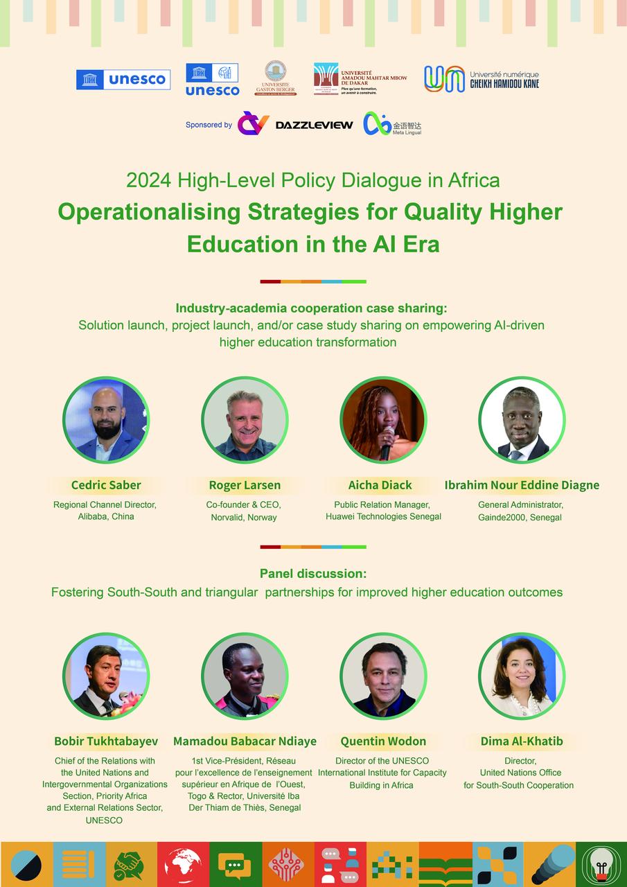 The 2024 High-Level Policy Dialogue in Africa, themed "Operationalising Strategies for Quality Higher Education in the AI Era", will be co-organized by UNESCO, UNESCO-ICHEI, and partner higher education institutions (HEIs) in Dakar, Senegal on 13th December, 2024. The policy dialogue will convene senior officials from government agencies overseeing higher education, HEI leadership and teaching personnel, private sector entities, industry professionals and experts, representatives from international and regional organisations, and other partners to explore the transformation of Africa's higher education in the AI era, with emphasis on the policy trends, gender equality, and teachers' professional development. UNESCO and UNESCO-ICHEI will jointly launch a multilateral cooperation project in support of the digital transformation of higher education in Africa at the event.