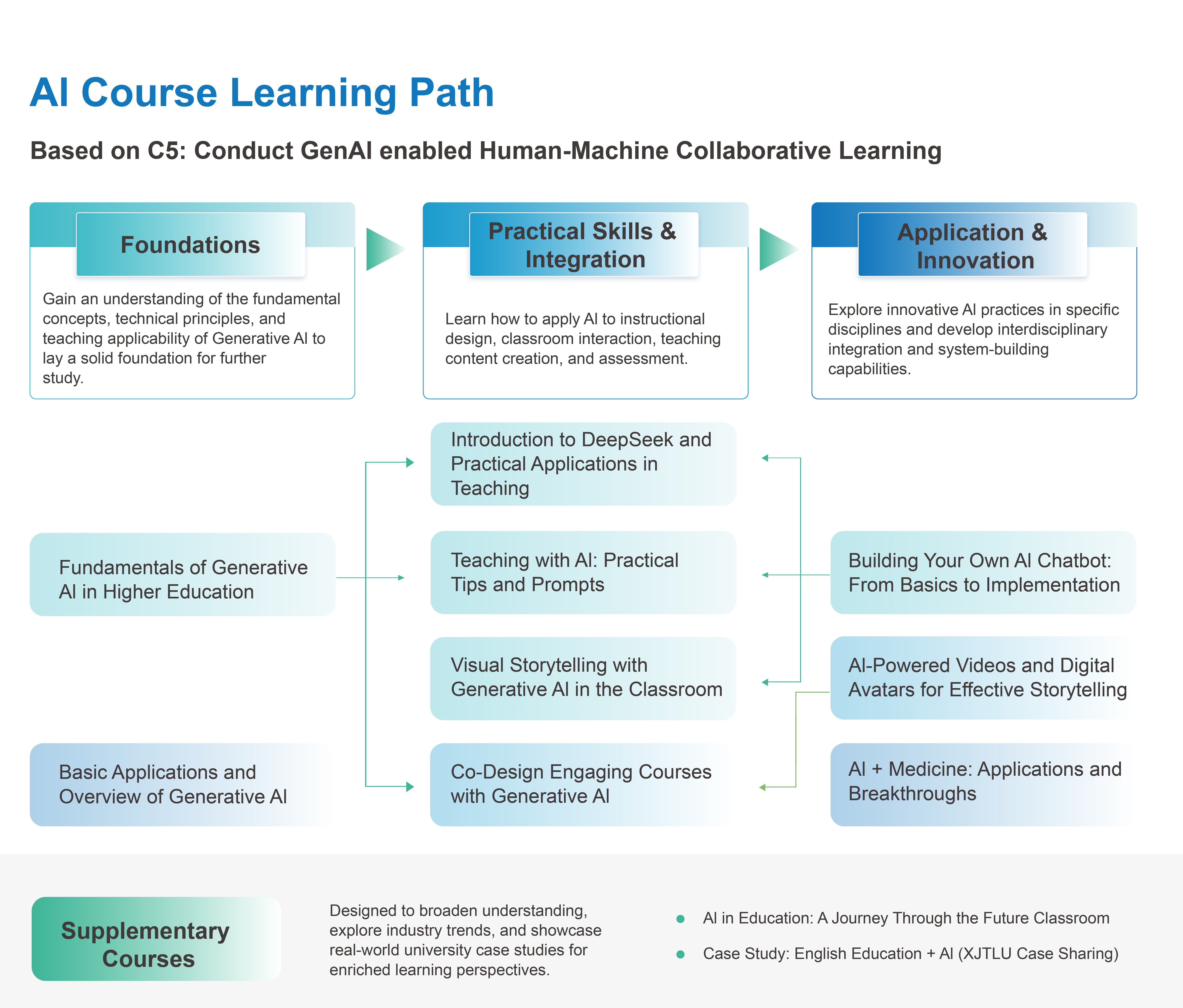 «AI+ Disciplines» Série de cours et parcours d’apprentissageEn 2025, l’IIOE poursuivra le développement de la série «IA+Disciplines», en explorant de manière approfondie l’intégration interdisciplinaire de l’IA, en se concentrant sur des scénarios d’application concrets et des innovations spécifiques à chaque domaine. Par ailleurs, l’IIOE a conçu un parcours d’apprentissage exclusif dédié à l’IA, couvrant : les Fondements de l’IA (concepts fondamentaux et principes techniques), les Compétences pratiques et l’intégration de l’IA (pratique technologique et méthodes d’intégration), et l’Application et l’innovation en IA (intégration interdisciplinaire et construction de systèmes), permettant ainsi aux apprenants de développer de manière systématique un ensemble complet de compétences allant de la théorie à la pratique et de la technologie à l’innovation.