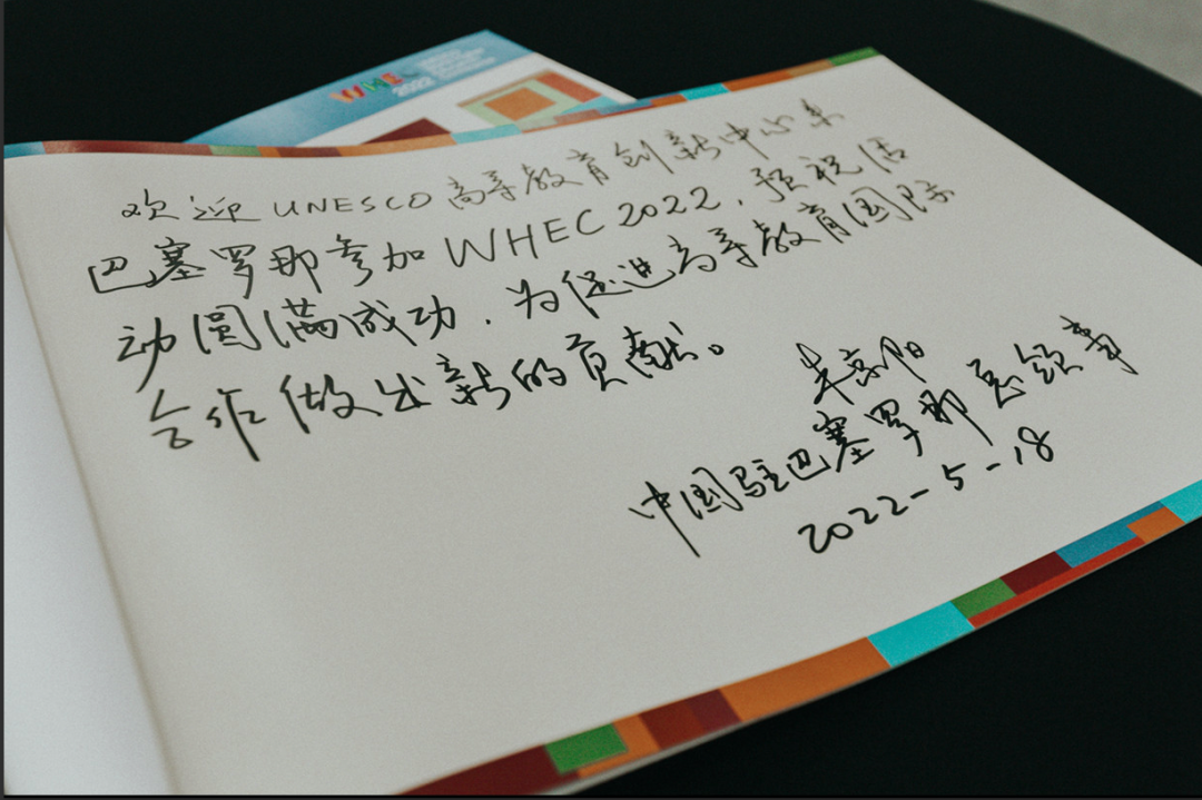 朱京阳总领事高度评价了创新中心做出的工作成就。他认为创新中心的工作为国与国之间文明的交流互鉴提供了教育合作的新范式,通过分享发展经验,开展智力合作,可以使得合作的成果更加长久与深远。朱京阳总领事还向创新中心代表团介绍了中国与加泰罗尼亚自治区教育交流的情况,以及对创新中心开展“南-北-南”跨区域合作规划的支持。 在访问的最后,朱京阳总领事为创新中心题字,欢迎创新中心来巴塞罗那参加世界高教大会,并预祝创新中心主持的活动取得圆满成功,为促进高等教育国际合作做出更多贡献。 朱京阳总领事为创新中心参会纪念册题字