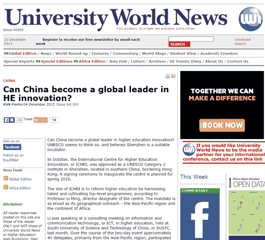 大学世界新闻网站报道截图 近日,大学世界新闻网(university world news)刊发特别报道《Can China become a global leader in HE innovation?》,从中国参与国际高等教育改革的视角,介绍联合国教科文卫二类机构——国际高等教育创新中心获批在深圳成立,以及南方科技大学所担负的重要角色和国际高等教育创新中心的宗旨使命。我们对该文进行编译整理后转发,以飨读者。大学世界新闻网是全球首家报道世界高等教育新闻的出版机构。作为高等教育的环球之窗,其总部位于伦敦,分支机构分布于迪拜、蒙特利尔、哥本哈根和墨尔本。全球具备丰富教育经验的知名记者为该网撰文,向关注国际高等教育发展的读者提供全新视角。 以下为原文编译:中国能成为国际高等教育改革的引领者吗? 在全球高等教育创新的浪潮中,中国能成为引领者?联合国教科文组织相信深圳是一个合适的孵化地。今年十月,国际高等教育创新中心获得联合国教科文卫组织批复成立,成为联合国教科文卫二类机构的一员。机构成立签约仪式将于2016年春天举行。南方科技大学党委书记、南科大UNESCO二类机构筹备工作组组长李铭教授
